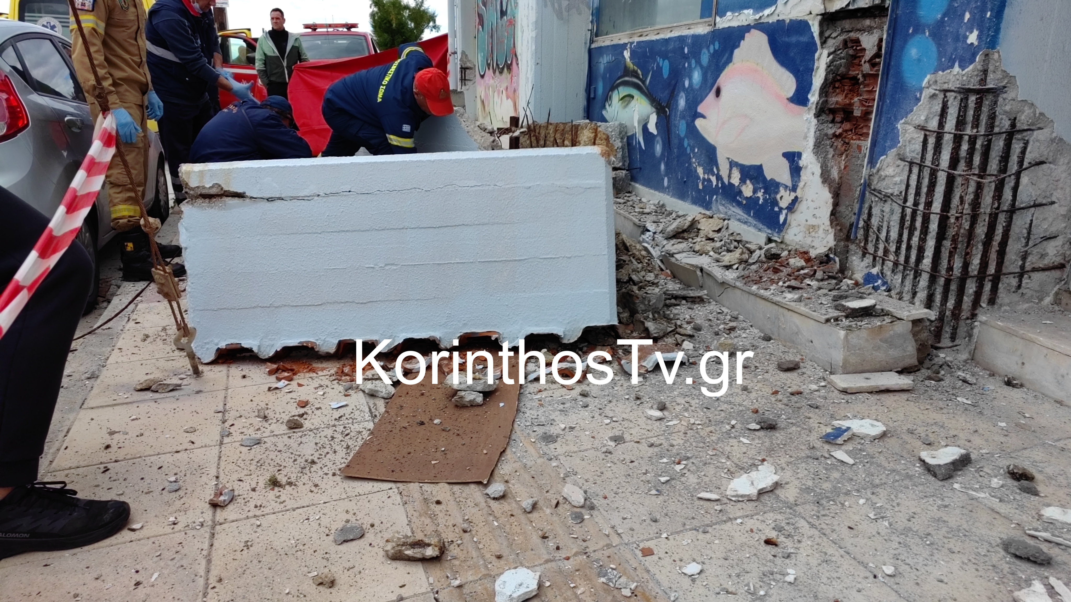 Το περιστατικό συνέβη στην οδό Πηγάσου, στην περιοχή Καλάμια Κορίνθου. Σύμφωνα με πληροφορίες, η γυναίκα περνούσε από το σημείο ακριβώς εκείνη τη στιγμή με το παιδί της, δεν πρόλαβε να αντιδράσει και εγκλωβίστηκε κάτω από τον όγκο των δομικών υλικών και του τσιμέντου. Οι πυροσβεστικές δυνάμεις που μετέβησαν στο σημείο, πέντε πυροσβέστες με δύο οχήματα, ανέσυραν τη 43χρονη γυναίκα χωρίς τις αισθήσεις και στη συνέχεια την παρέδωσαν στο ΕΚΑΒ. Η άτυχη γυναίκα διέμενε στη Γερμανία και είχε έρθει στην Ελλάδα για διακοπές του Πάσχα.