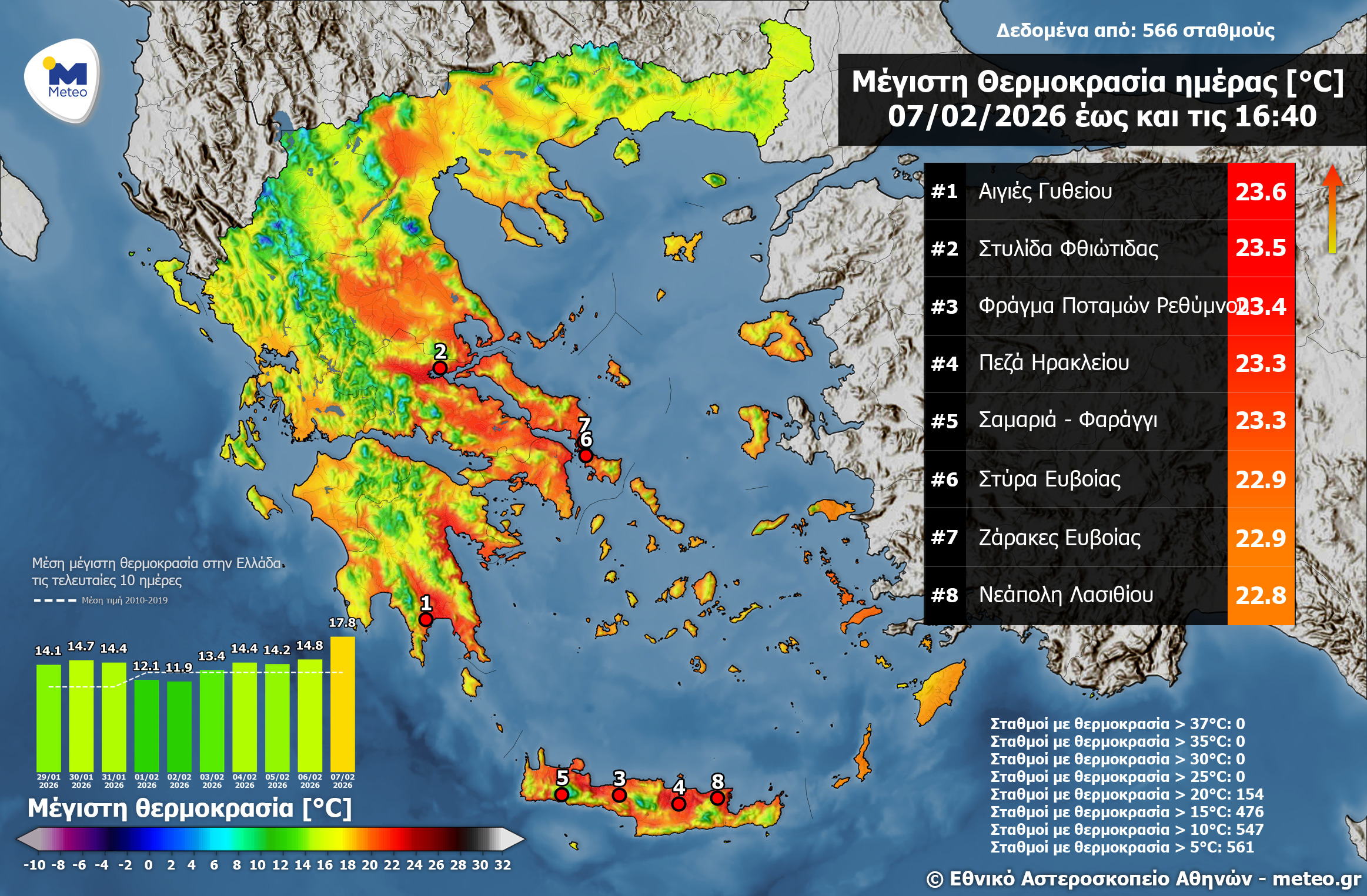 Υψηλές μέγιστες θερμοκρασίες σημειώθηκαν στη χώρα και το Σάββατο 07/02, με τις μέγιστες τιμές να ξεπερνούν τοπικά τους 23°C. Σύμφωνα με το δίκτυο αυτόματων μετεωρολογικών σταθμών του Εθνικού Αστεροσκοπείου Αθηνών / meteo.gr, η υψηλότερη μέγιστη θερμοκρασία καταγράφηκε στις Αιγιές Γυθείου με 23,6 °C.