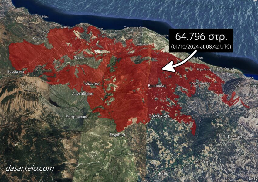 O αρχικός απολογισμός των καμένων εκτάσεων ειναι 65.00 στρέμματα από την φωτιά στην Κορινθία, σύμφωνα με την χαρτογράφηση του Copernicus EMSR.