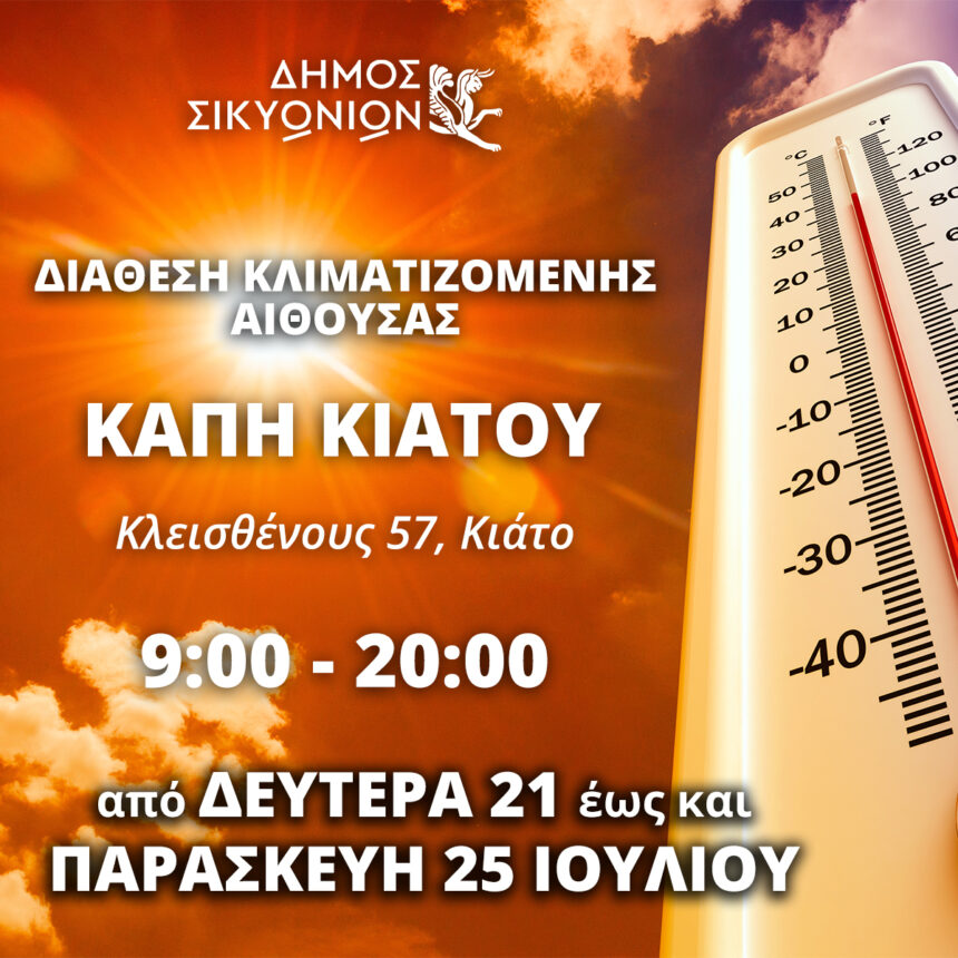 Ενόψει του κύματος καύσωνα που θα πλήξει τη χώρα μας τις επόμενες μέρες, ακολουθούμε απλές οδηγίες πρόληψης των επιπτώσεων από την εμφάνιση υψηλών θερμοκρασιών. Ιδιαίτερη προσοχή σε ηλικιωμένους, εγκύους, παιδιά και ευπαθείς ομάδες. Θυμίζουμε ότι από σήμερα Δευτέρα 21 έως και την Παρασκευή 25 Ιουλίου η κλιματιζόμενη αίθουσα του ΚΑΠΗ Κιάτου βρίσκεται στη διάθεση του κοινού από τις 9:00 το πρωί έως και τις 8:00 το βράδυ.