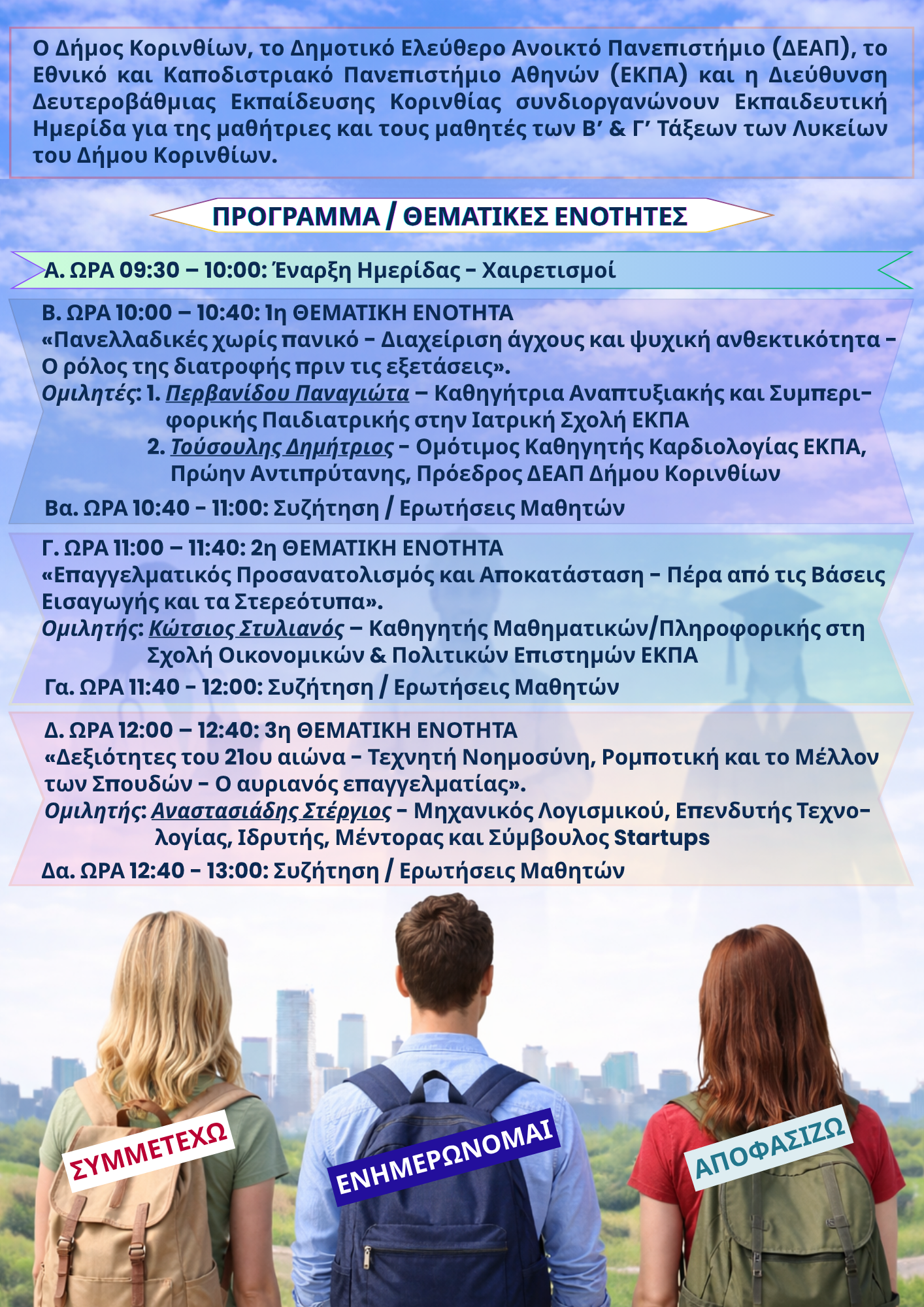 Ακριβώς σε αυτή την ανάγκη έρχεται να απαντήσει η ημερίδα για τον επαγγελματικό προσανατολισμό που συνδιοργανώνουν Τετάρτη 29/04/2026, από τις 09:30 το πρωί μέχρι τη 1:00 το μεσημέρι, ο Δήμος Κορινθίων, το Δημοτικό Ελεύθερο Ανοικτό Πανεπιστήμιο (ΔΕΑΠ), το Εθνικό και Καποδιστριακό Πανεπιστήμιο Αθηνών (ΕΚΠΑ) και η Διεύθυνση Δευτεροβάθμιας Εκπαίδευσης Κορινθίας.