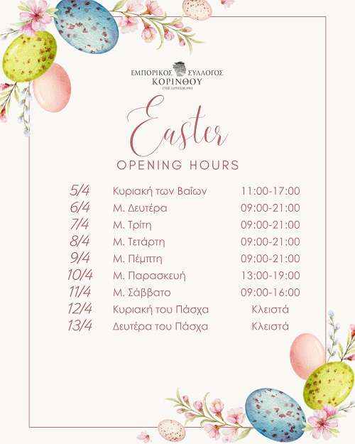 Σύμφωνα με τις ανακοινώσεις των εμπορικών συλλόγων, τα εμπορικά καταστήματα το Μεγάλο Σάββατο (11 Απριλίου) θα λειτουργήσουν από τις 09:00 έως τις 16:00, δίνοντας τη δυνατότητα στους καταναλωτές να ολοκληρώσουν τις αγορές τους εγκαίρως.