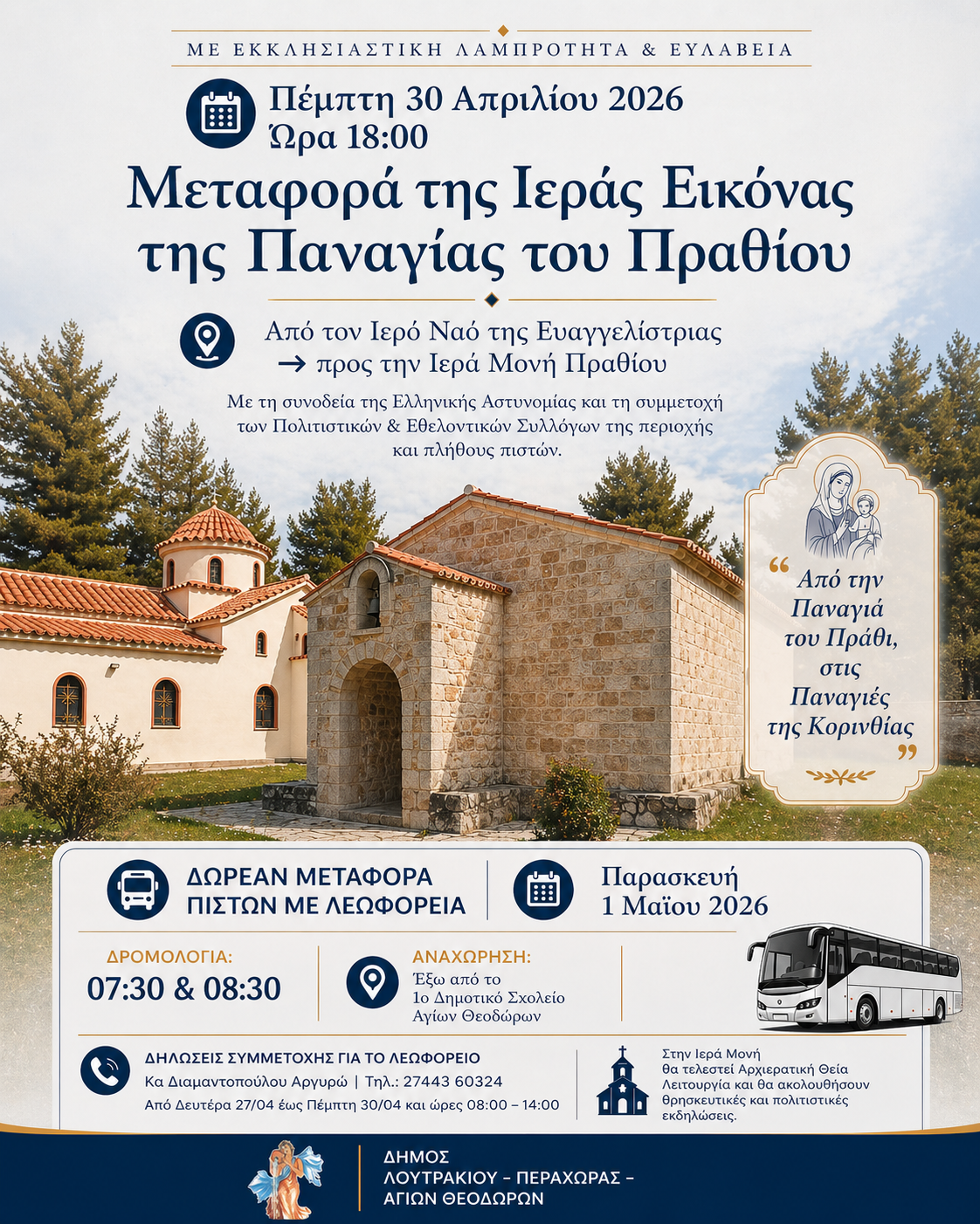 Ο Δήμος Λουτρακίου – Περαχώρας – Αγίων Θεοδώρων σας ενημερώνει ότι την Πέμπτη 30 Απριλίου 2026 και ώρα 18:00 θα πραγματοποιηθεί, με ιδιαίτερη ευλάβεια και κατάνυξη, η μεταφορά της Ιεράς Εικόνας της Παναγίας του Πραθίου από τον Ιερό Ναό της Ευαγγελίστριας προς την Ιερά Μονή Πραθίου.