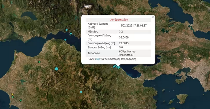 Σεισμός 3,2 Ρίχτερ σημειώθηκε στις 19:28 την Πέμπτη (19/2) στο Ξυλόκαστρο.