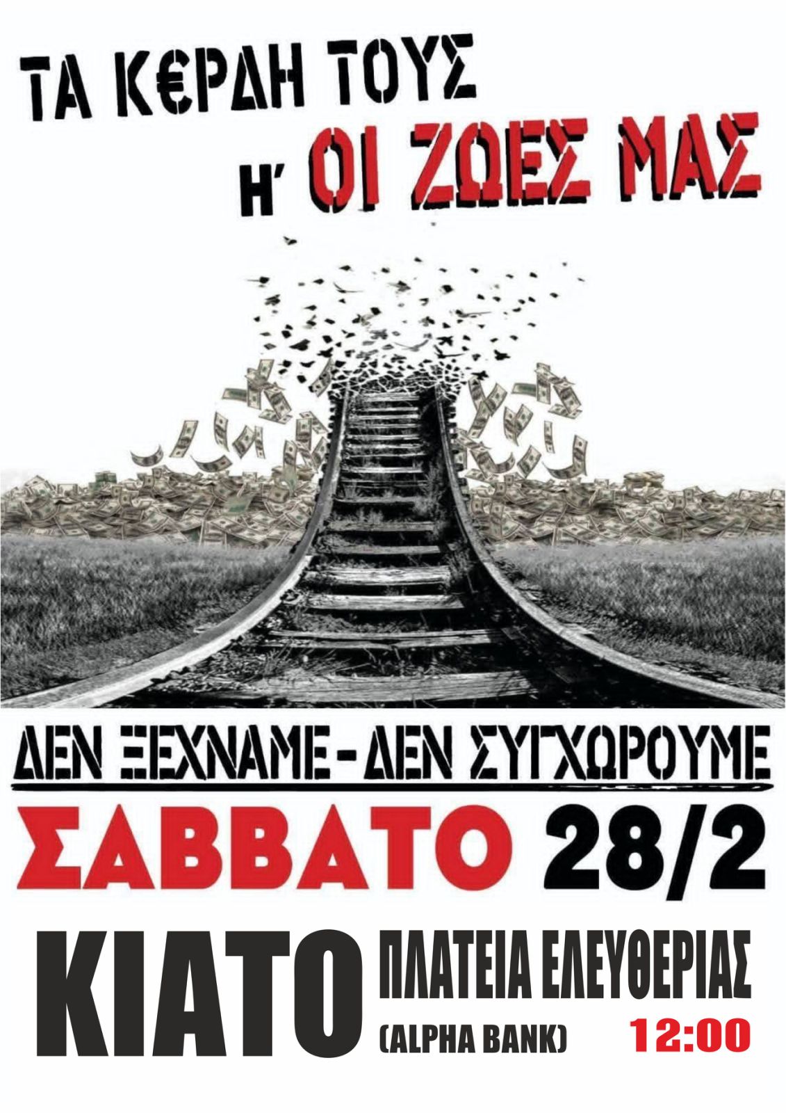 Όλες κι όλοι συμμετέχουμε το Σάββατο 28 Φεβρουαρίου και ώρα 12.00μ.μ. στην συγκέντρωση που θα πραγματοποιηθεί στο Κιάτο στην Πλατεία Ελευθερίας (μπροστά από ALPHA BANK) .