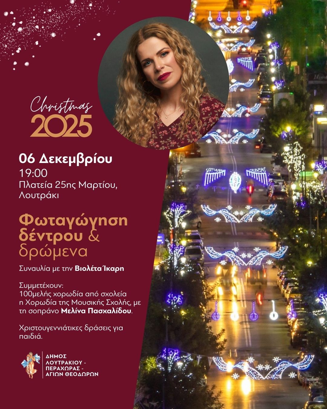 Το Σάββατο 6 Δεκεμβρίου, στις 19:00, σας περιμένουμε όλες και όλους σε μια γιορτή γεμάτη πολύχρωμα φώτα, μουσική, τραγούδια και εορταστικά δρώμενα.