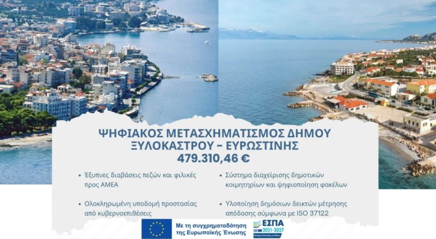 Ο Δήμος Ξυλοκάστρου – Ευρωστίνης κάνει ένα αποφασιστικό βήμα προς τη νέα ψηφιακή εποχή, με την ένταξη της Πράξης «Δράσεις Ψηφιακού Μετασχηματισμού του Δήμου Ξυλοκάστρου – Ευρωστίνης» στο Πρόγραμμα «Ψηφιακός Μετασχηματισμός 2021-2027», συνολικού προϋπολογισμού 479.310,46 ευρώ.