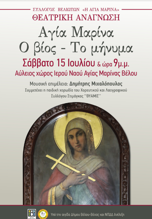Ο Σύλλογος Βελιωτών «Η Αγία Μαρίνα» σας προσκαλεί στο πολιτιστικό δρώμενο που διοργανώνει για την εορτή της πολιούχου της Δημοτικής Κοινότητας Βέλου, με τίτλο: