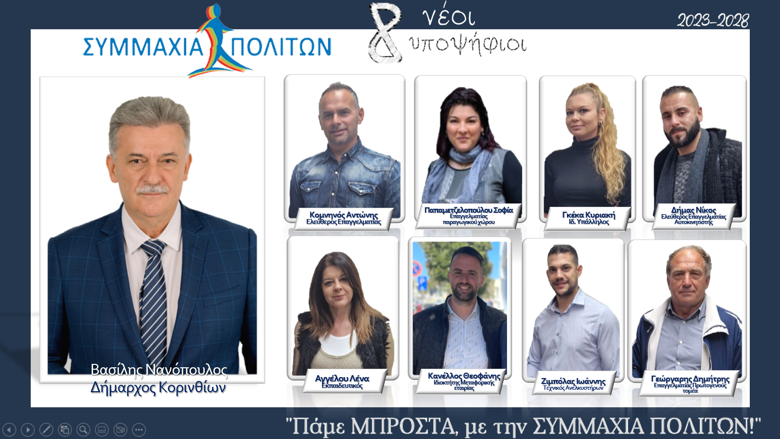 Με ταχείς ρυθμούς συνεχίζεται η στελέχωση, η ανανέωση και η διεύρυνση  του συνδυασμού του Δημάρχου Κορινθίων Βασίλη Νανόπουλου. Κορίνθιοι και Κορίνθιες ανταποκρίνονται με ζέση στο κάλεσμα του Δημάρχου και γίνονται συμμέτοχοι της αλλαγής που ήδη συντελείται στο δήμο Κορινθίων από το 2019, της Αλλαγής που στα επόμενα χρόνια εντείνεται και δημιουργεί στην ουσία τον Δήμο που μας αξίζει! Οι  υποψήφιοι που ανακοινώνονται σήμερα θέτουν για πρώτη φορά εαυτόν στα κοινά αναγνωρίζοντας στην δημοτική αρχή και στον δήμαρχο Βασίλη Νανόπουλο το όραμα, την προοπτική, το αποτέλεσμα που δεσμεύτηκε στους πολίτες το 2019.