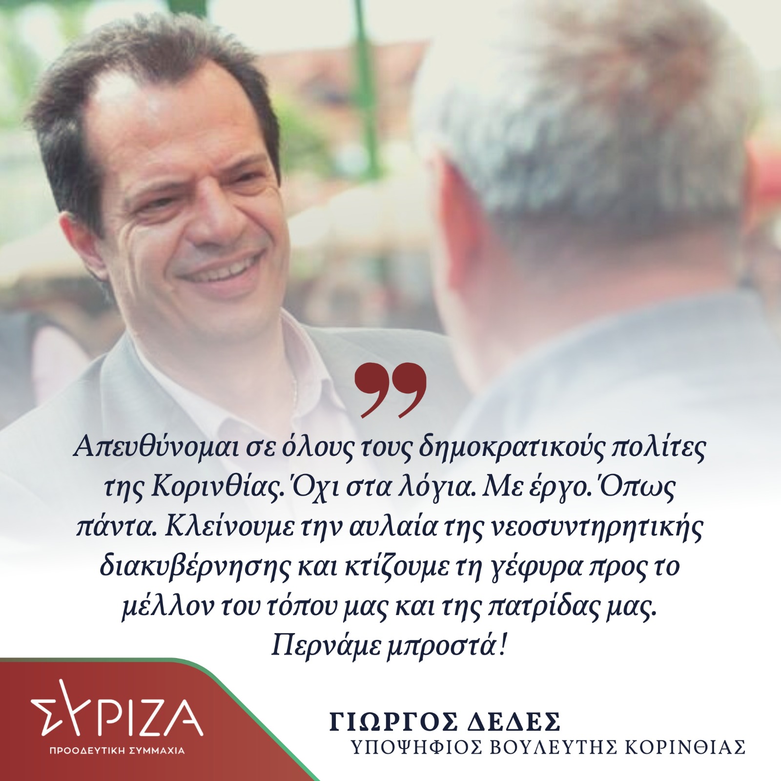 Απευθύνομαι σε όλους τους δημοκρατικούς πολίτες της Κορινθίας. Όχι στα λόγια. Με έργο. Όπως πάντα. Κλείνουμε την αυλαία της νεοσυντηρητικής διακυβέρνησης και κτίζουμε τη γέφυρα προς το μέλλον του τόπου μας και της πατρίδας μας.