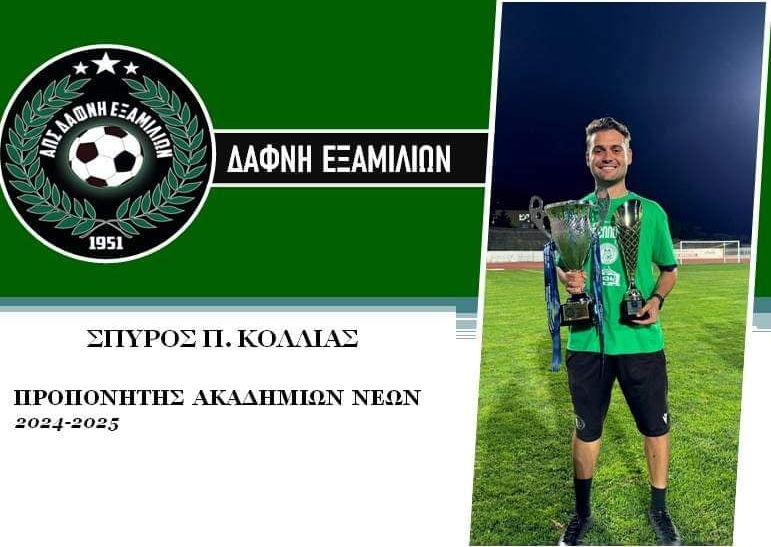 Tην κίνηση του καλοκαιριού έκανε η Δαφνη Εξαμιλίων, δίνοντας τα κλειδιά των ακαδημιών της στον πρωταθλητή Γ εθνικής κατηγορίας με την ομάδα του Παναργειακού , Κόλλια Σπύρο. Ένας πρωταθλητης εθνικού πρωταθλήματος με ήθος,κατάρτιση και σοβαρότητα.