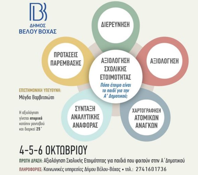 Η πρώτη δράση αφορά την αξιολόγηση σχολικής ετοιμότητας για παιδιά της Α’ Δημοτικού και θα πραγματοποιηθεί στις 4, 5 και 6 Οκτωβρίου. Η αξιολόγηση θα διεξάγεται ατομικά κατόπιν ραντεβού και θα διαρκεί 25 λεπτά. Μετά την αξιολόγηση, οι οικογένειες θα λαμβάνουν αναλυτική έκθεση με τα αποτελέσματα και προτάσεις για την υποστήριξη των μαθητών.