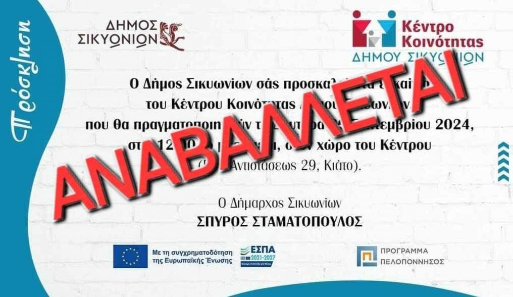 ΑΝΑΒΑΛΛΕΤΑΙ η προγραμματισμένη για τη Δευτέρα 30 Σεπτεμβρίου 2024, εκδήλωση των εγκαινίων του Κέντρου Κοινότητας Δήμου Σικυωνίων, καθώς μαίνεται η καταστροφική πυρκαγια στον γειτονικό μας Δήμο Ξυλοκάστρου-Ευρωστίνης.