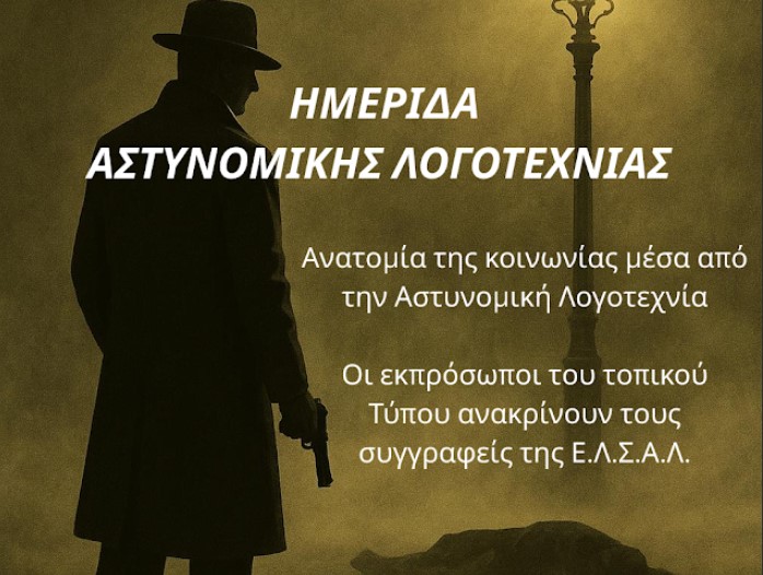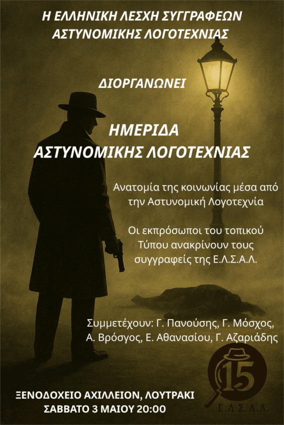 Η Ελληνική Λέσχη Αστυνομικής Λογοτεχνίας (ΕΛΣΑΛ) πραγματοποιεί ημερίδα με θέμα “Ανατομία της κοινωνίας μέσα από την αστυνομική λογοτεχνία”, το Σάββατο 3 Μαΐου, στις 8.00 μ.μ., στο ξενοδοχείο Αχίλειον, Ελ. Βενιζέλου 12, Λουτράκι.