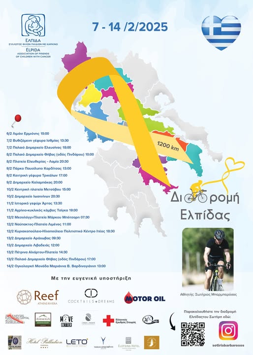 Την Παρασκευή 7 Φεβρουαρίου, στις 13:30 υποδεχόμαστε στην βυθιζόμενη γέφυρα Ισθμίας, τον αθλητή Σωτήρη Μπαρμπαρόσο, ο οποίος θα διανύσει 1.200 χιλιόμετρα με το ποδήλατό του, μεταφέροντας ένα ισχυρό μήνυμα ελπίδας και στήριξης για τα παιδιά που δίνουν τη μάχη τους με τον καρκίνο.