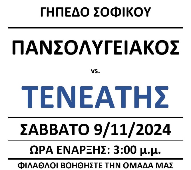 Το Σάββατο 9 Νοεμβρίου και ώρα 3 μ.μ. αντιμετωπίζουμε στο γήπεδο Σοφικού την ομάδα του ΠΑΝΣΟΛΥΓΕΙΑΚΟΥ.