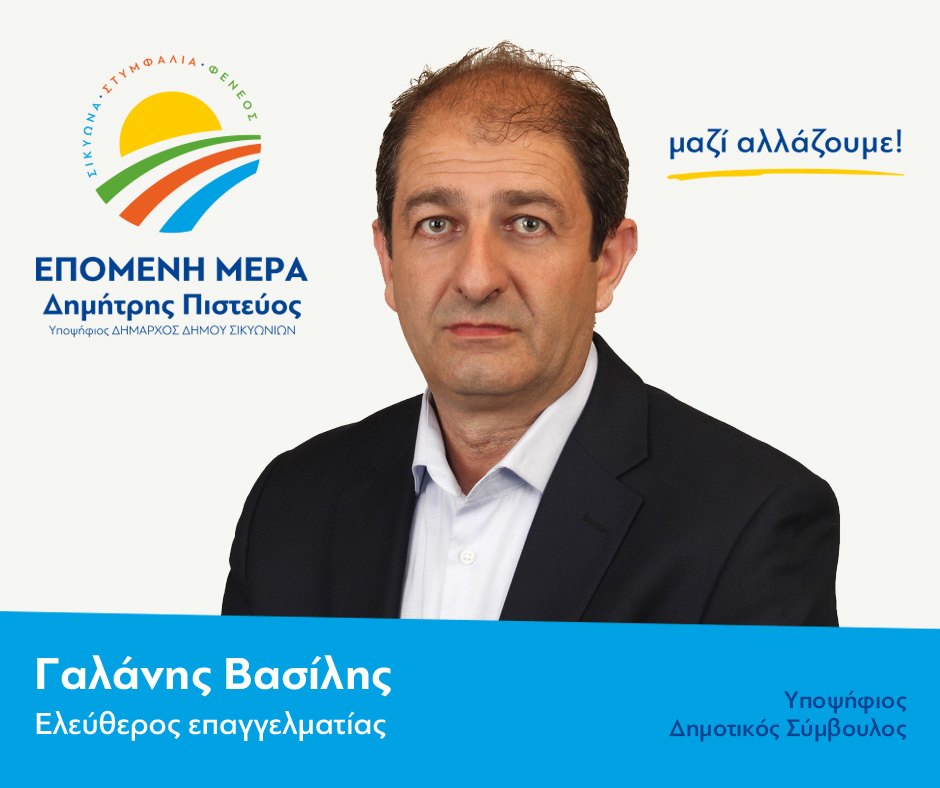 Φίλες και Φίλοι του Δήμου Σικυωνίων, με ιδιαίτερη χαρά επικοινωνώ μαζί σας προκειμένου να σας εκφράσω την πρόθεση μου να κατέλθω υποψήφιος Δημοτικός σύμβουλος στο Δήμο μας με την παράταξη <<Επόμενη Μέρα >> του υποψήφιου Δημάρχου κ. Δημήτρη Πιστεύου.