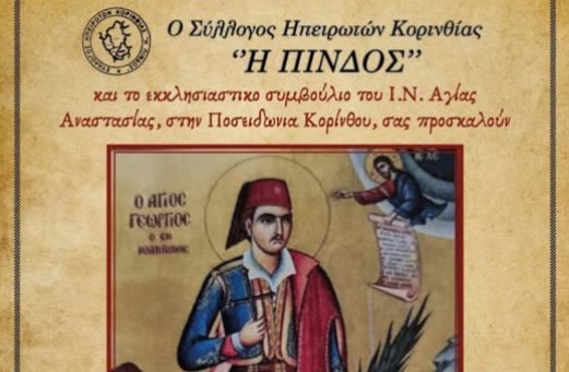 Ο Πρόεδρος και το Δ.Σ. του Συλλόγου Ηπειρωτών Κορινθίας “Η Πίνδος”, σας προσκαλούν να παραστείτε στον Μέγα Ασματικό Εσπερινό για τον εορτασμό του Αγίου Γεωργίου του Φουστανελά την Πέμπτη 16/1/2025 και ωρα 17.30μμ στον Ιερό Ναό της Αγίας Αναστασίας, στην Ποσειδωνία Κορίνθο.