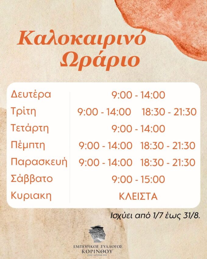 Ο Εμπορικός Σύλλογος Κορίνθου μας ενημερώνει για το ωράριο λειτουργίας των καταστημάτων:
