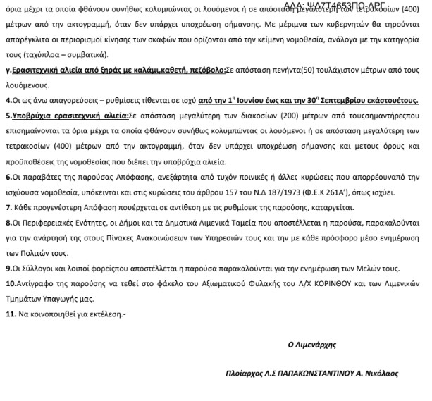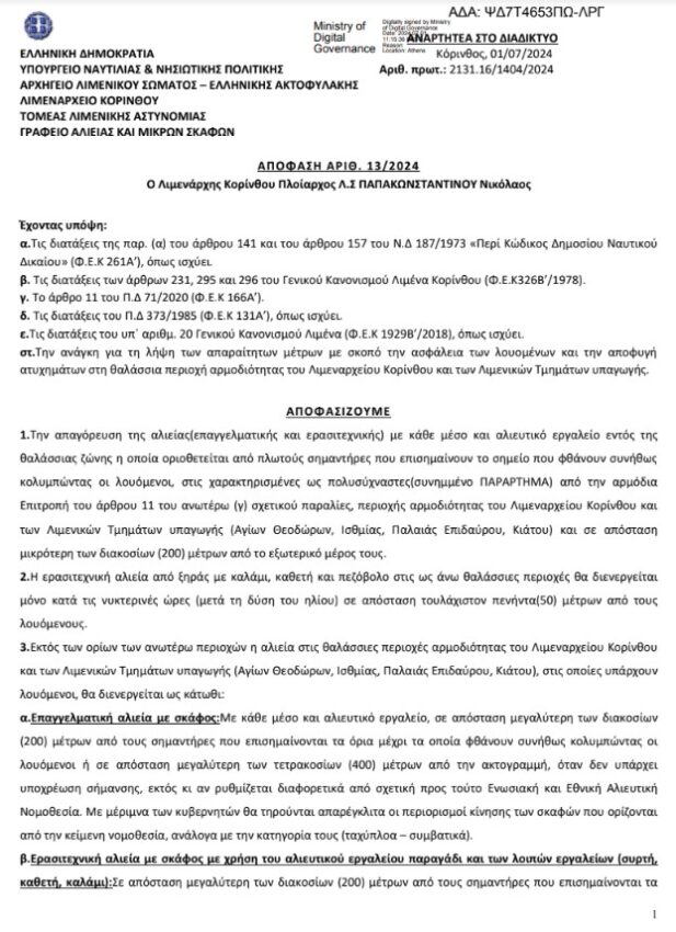 Δημοσιεύτηκε η απόφαση περί απαγόρευσης αλιείας, επαγγελματικής και ερασιτεχνικής, κατά την θερινή περίοδο από το Λιμεναρχείο Κορίνθου.