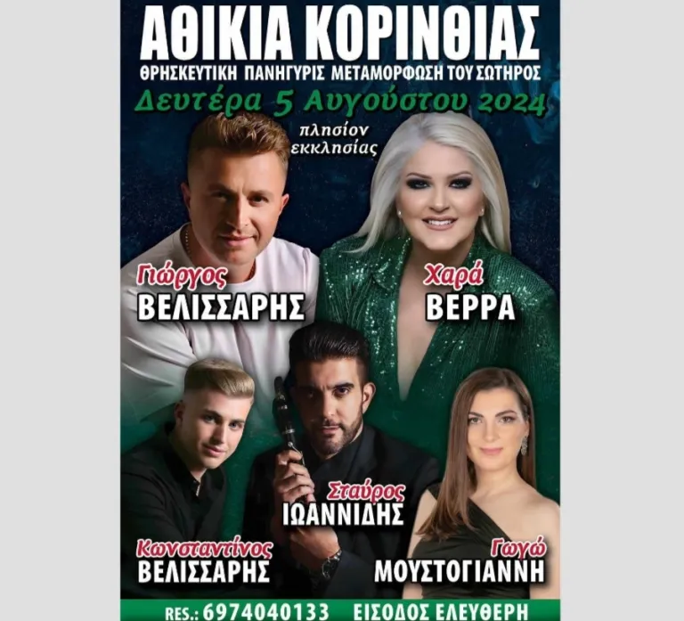 Η θρησκευτική πανήγυρη για την εορτή Μεταμόρφωσης του Σωτήρος θα διεξαχθεί τη Δευτέρα 5 Αυγούστου, πλησίον της εκκλησίας Μεταμόρφωσης του Σωτήρος, στα Αθίκια Κορινθίας