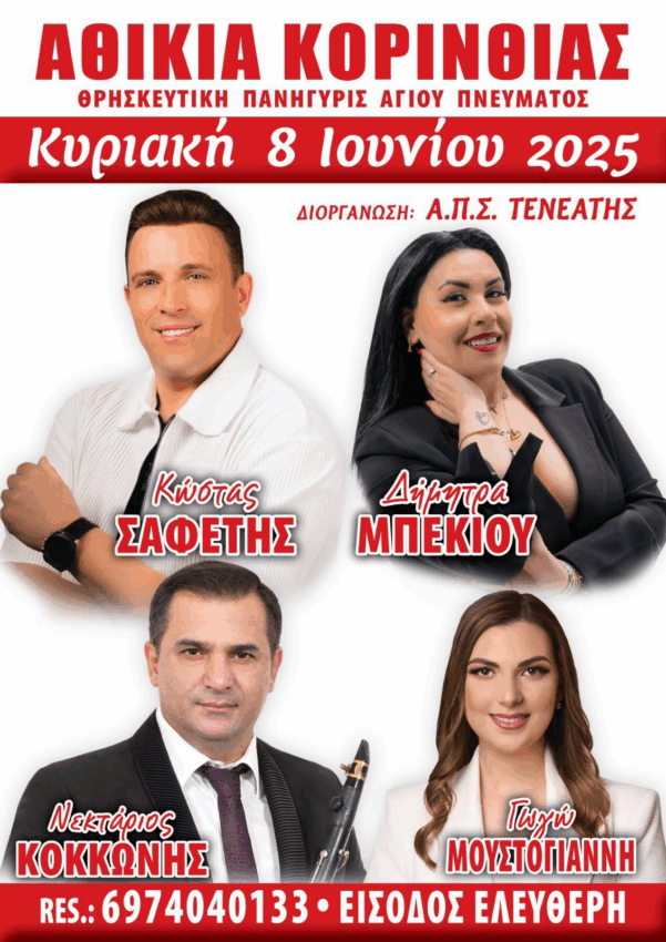 Το πανηγύρι του Αγίου Πνεύματος θα διεξαχθεί την την Κυριακή 8 Ιουνίου 2025 στα Αθίκια Κορινθίας, θα τραγουδήσουν, Κώστας Σαφέτης Δήμητρα Μπέκιου και η Γωγώ Μουστόγιαννη, στo κλαρίνο ο Νεκτάριος Κοκκώνης.