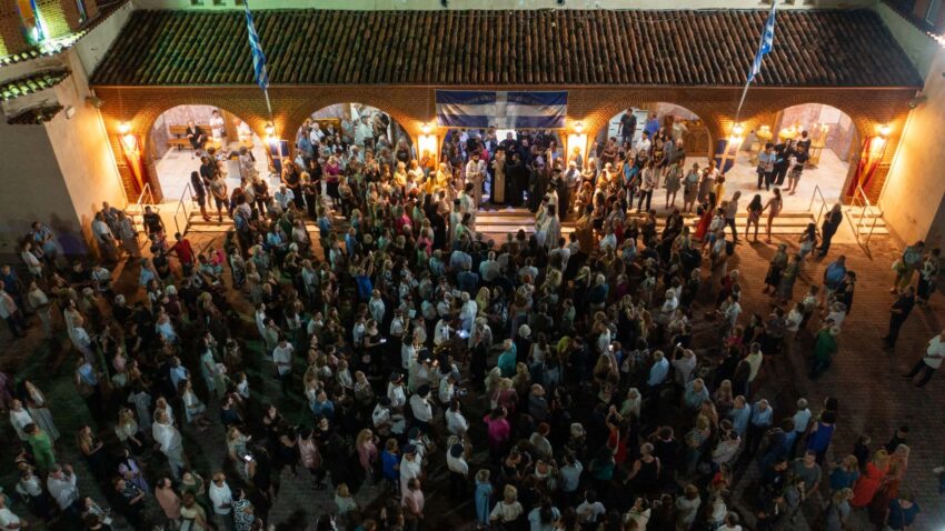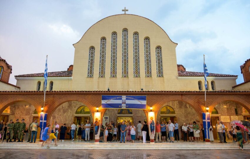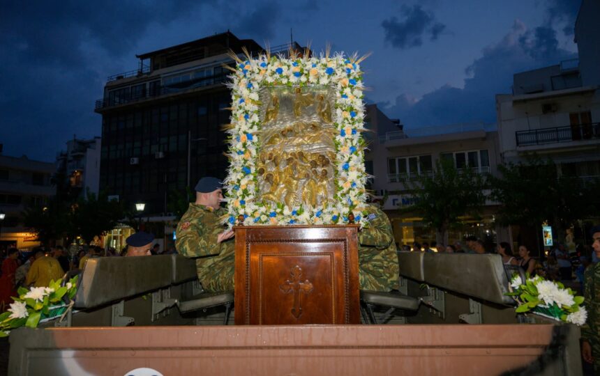 Πλήθος πιστών συνέρρευσε από νωρίς στον πανηγυρίζοντα Ιερό Ναό για να παρακολουθήσει τον Μεγάλο Πανηγυρικό Εσπερινό μετ’ αρτοκλασίας και την καθιερωμένη λιτάνευση της Ιεράς Εικόνας στους δρόμους της πόλης.