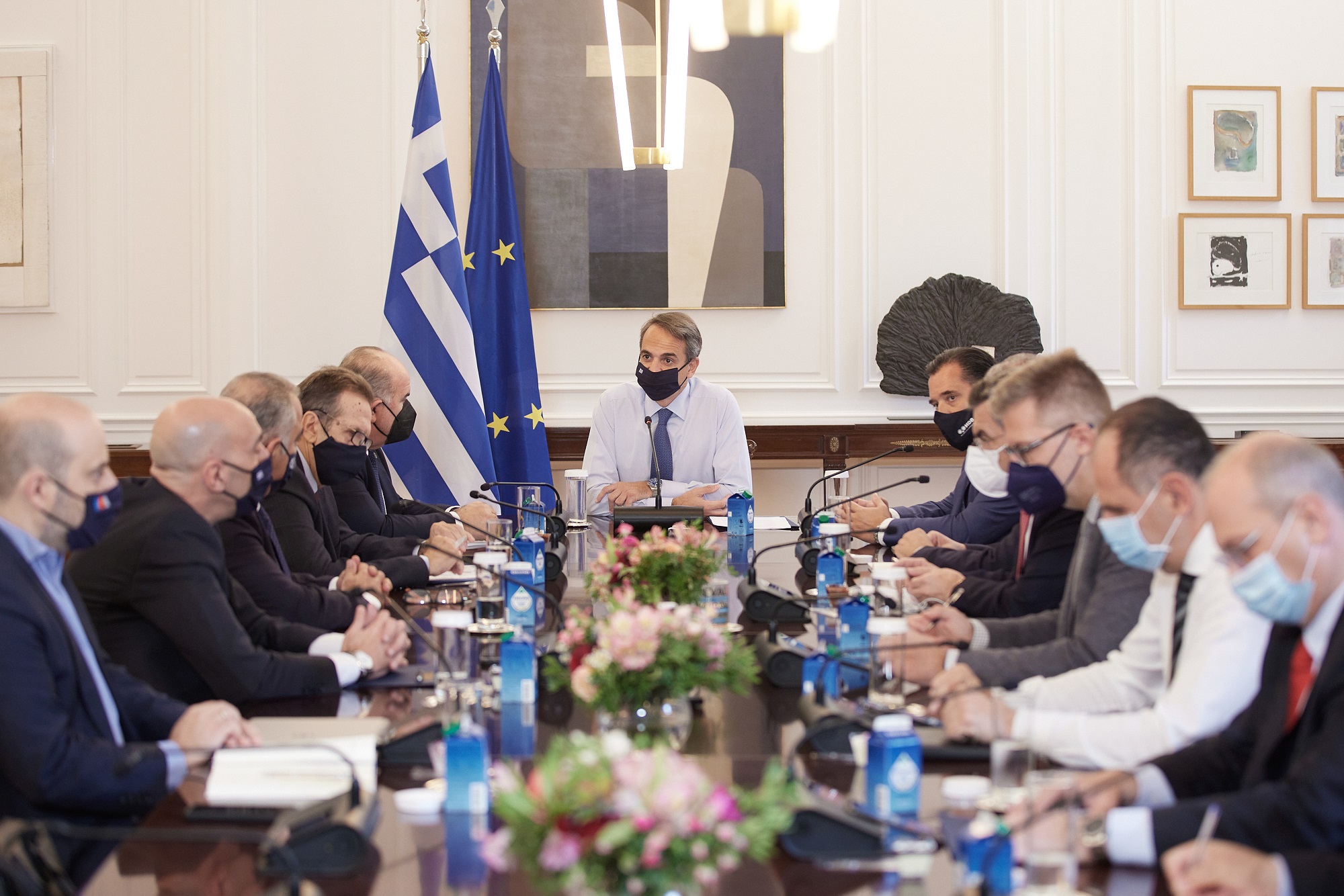 Σύσκεψη υπό τον Πρωθυπουργό Κυριάκο Μητσοτάκη με θέμα την εφαρμογή των μέτρων για την αντιμετώπιση της πανδημίας στους χώρους της εστίασης και των εμπορικών καταστημάτων. (ΔΗΜΗΤΡΗΣ ΠΑΠΑΜΗΤΣΟΣ/ΓΡΑΦΕΙΟ ΤΥΠΟΥ ΠΡΩΘΥΠΟΥΡΓΟΥ/EUROKINISSI)