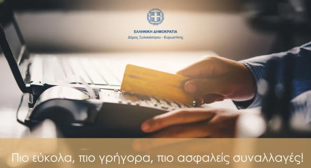 Ο Δήμος Ξυλοκάστρου-Ευρωστίνης ενημερώνει τους δημότες ότι, σε εφαρμογή τραπεζικής οδηγίας, οι συναλλαγές στο Ταμείο του Δήμου θα πραγματοποιούνται πλέον αποκλειστικά με χρήση χρεωστικής ή πιστωτικής κάρτας.