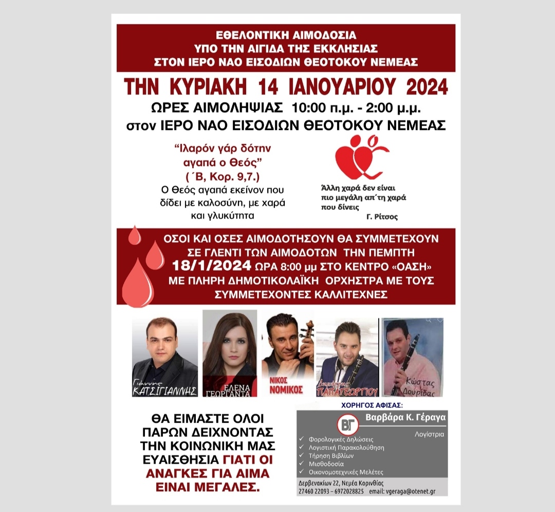Αιμοδότη – ΑιμοδότισσαΕνορίτη – ΕνορίτισσαΜε στόχο την ανάπτυξη της Αιμοδοσίας , και την Αγωνιώδη Υπερπροσπάθεια που καταβάλαμε στο χώρο της Αιμοδοσίας τις τελευταίες Δεκαετίες τελούμε την  ΧΕΙΜΕΡΙΝΗ ΑΙΜΟΔΟΣΙΑ ΤΗΝΚΥΡΙΑΚΗ 14 ΙΑΝΟΥΑΡΙΟΥ 2024στον ΙΕΡΟ ΝΑΟ ΕΙΣΟΔΙΩΝ ΘΕΟΤΟΚΟΥ ΝΕΜΕΑΣΩΡΕΣ ΑΙΜΟΛΗΨΙΑΣ  10:00 π.μ. – 2:00 μ.μ.  ΟΣΟΙ ΚΑΙ ΟΣΕΣ ΑΙΜΟΔΟΤΗΣΟΥΝ θα συμμετέχουν σε ΣΥΝΕΣΤΙΑΣΗ (ΔΕΙΠΝΟ-ΔΙΑΣΚΕΔΑΣΗ ΜΕ ΖΩΝΤΑΝΗ ΟΡΧΡΗΣΤΡΑ) ΣΤΟ ΚΕΝΤΡΟ «ΟΑΣΗ» την Πέμπτη 18-1-2024 στις 8:00 μ.μ.