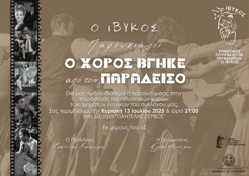 Ο Σύνδεσμος Λουτρακιωτών – Περαχωριτών «Ο ΙΒΥΚΟΣ» προσκαλεί το κοινό σε μια ξεχωριστή βραδιά αφιερωμένη στην παράδοση και τον ελληνικό χορό.