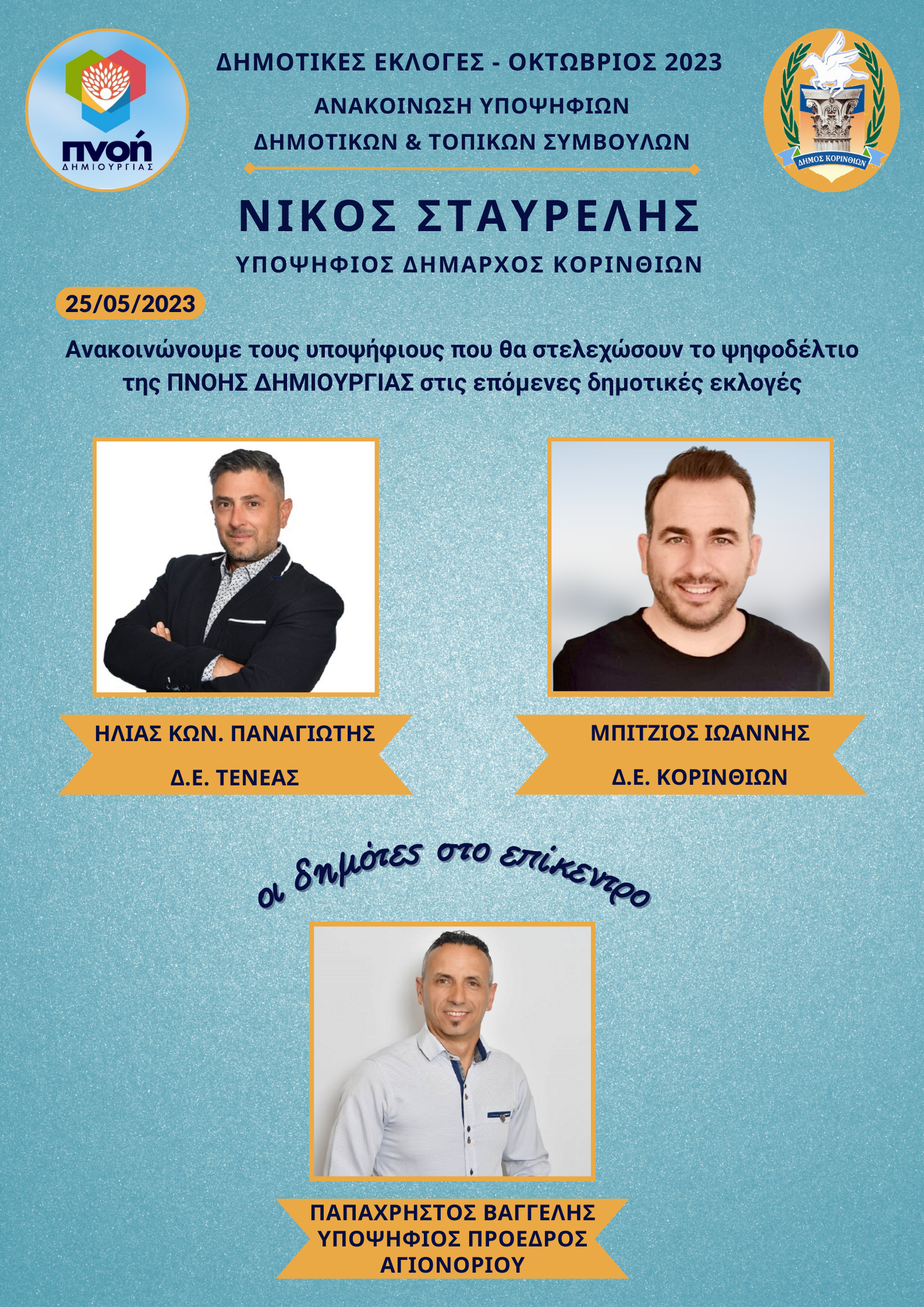 - ΗΛΙΑΣ ΚΩΝ. ΠΑΝΑΓΙΩΤΗΣ – Κατάγεται από το Αγιονόρι Κορινθίας και κατοικεί στο Συνοικισμό Κορίνθου. Είναι παντρεμένος και πατέρας δύο παιδιών. Ασχολείται με την καλλιέργεια, επεξεργασία και τυποποίηση αρωματικών φυτών καθώς και με την ελαιοπαραγωγή. Διατελεί Πρόεδρος του Εξωραϊστικού και Πολιτιστικού Συλλόγου Αγιονορίου «Ο ΝΙΚΗΤΑΡΑΣ» με μεγάλη επιτυχία τα τελευταία έτη, με σκοπό την ανάδειξη της πολιτιστικής κληρονομιάς της περιοχής, καθώς και με σειρά συνεχών έργων. Η ενεργή ενασχόλησή του με τα κοινά δρώμενα και η αφοσίωσή του σε αυτά αποτέλεσαν το κίνητρο για τη συμμετοχή του στη τοπική αυτοδιοίκηση. Ως υποψήφιος δημοτικός σύμβουλος με το συνδυασμό «Πνοή Δημιουργίας» ευελπιστεί να συνεισφέρει από τη θέση αυτή με τον καλύτερο δυνατό τρόπο στην τοπική κοινωνία. Πρώτη φορά συμμετέχει σε δημοτικές εκλογές.