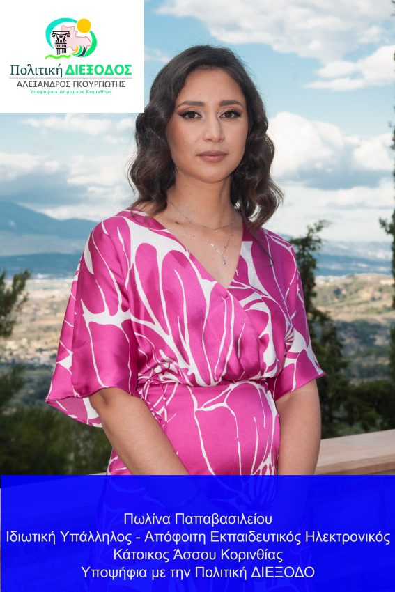 Η «Πολιτική ΔΙΕΞΟΔΟΣ» και ο επικεφαλής της Αλέξανδρος Γκουργιώτης, υποψήφιος Δήμαρχος Κορινθίων, καλωσορίζουμε την κ. Παπαβασιλειου Πωλίνα, που συμμετέχει στο ψηφοδέλτιο του Συνδυασμού μας για τη διεκδίκηση του Δήμου Κορινθίων στις προσεχείς Δημοτικές Εκλογές (Οκτώβριος 2023).