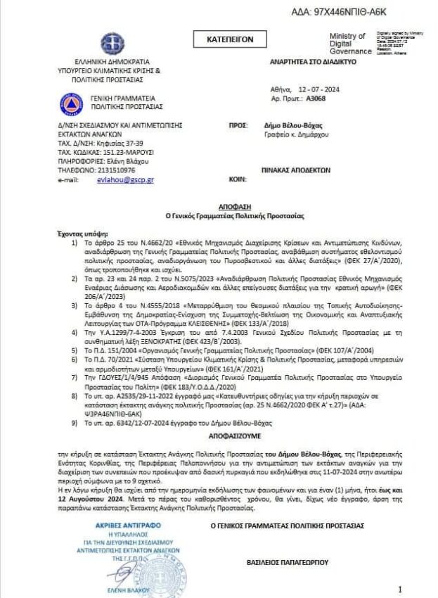 Σε κατάσταση έκτακτης ανάγκης, κηρύχθηκε ο Δήμος Βέλου – Βόχας, με απόφαση του Γενικού Γραμματέα Πολιτικής Προστασίας, για την αντιμετώπιση των έκτακτων αναγκών για τη διαχείριση των συνεπειών που προέκυψαν από την πυρκαγιά που εκδηλώθηκε την Πέμπτη 11/7 στην Στιμάγκα του Δήμου Βέλου Βόχας.