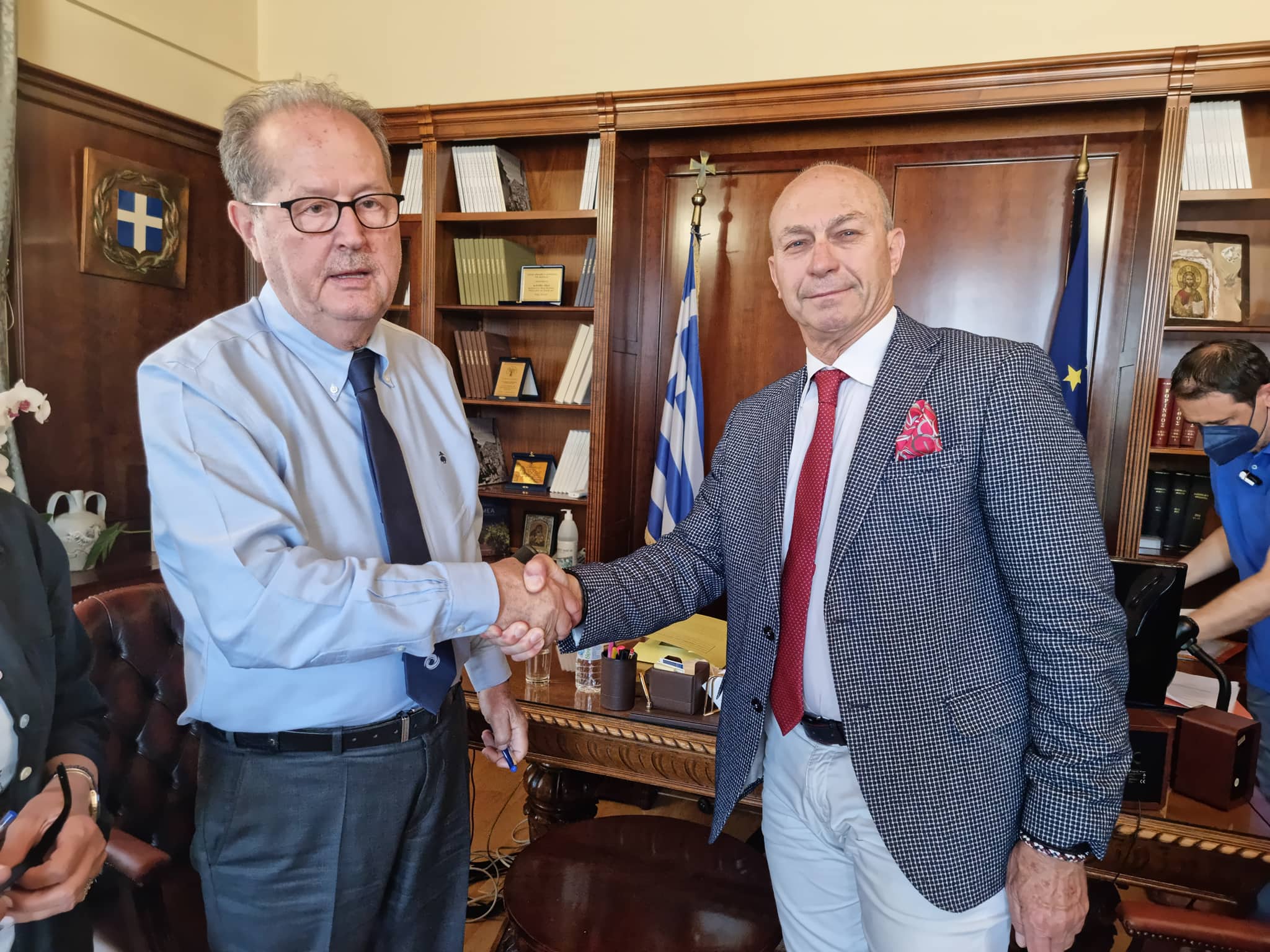 Προγραμματική σύμβαση με αντικείμενο την υλοποίηση του “έργου βελτίωσης και συντήρησης της επαρχιακής οδού Λουτρακίου – Περαχώρας”, στο πλαίσιο του οποίου θα κατασκευαστούν -μεταξύ άλλων- δύο ισόπεδοι κυκλικοί κόμβοι, υπέγραψαν ο Δήμαρχος Λουτρακίου – Περαχώρας – Αγίων Θεοδώρων Γεώργιος Αλκ. Γκιώνης και ο Περιφερειάρχης Πελοποννήσου Παναγιώτης Νίκας, το απόγευμα της Τετάρτης 1ης Ιουνίου 2022, στα γραφεία της Π.Ε. Κορινθίας.