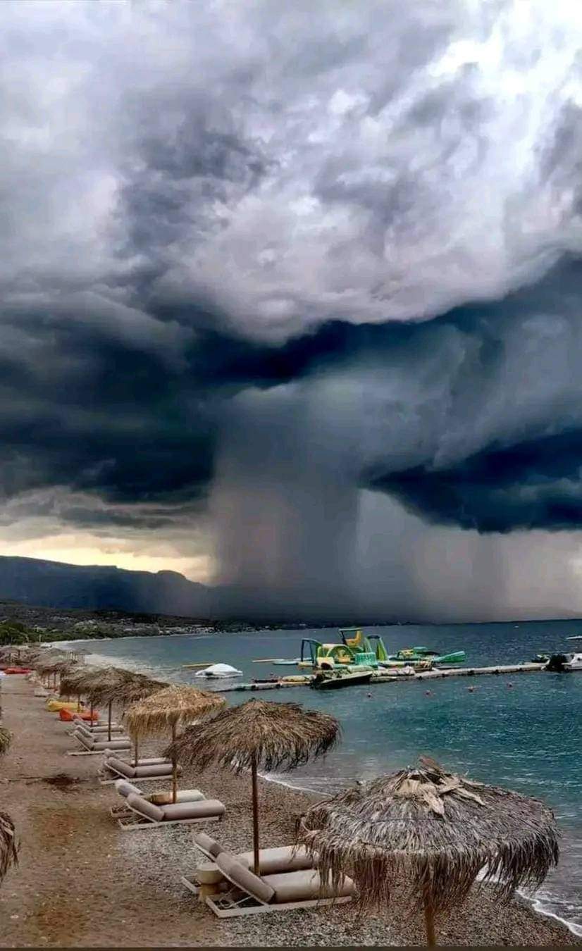 Όπως φαίνεται στην φωτογραφία που ανάρτησε ο Αντιδήμαρχος Αγίων Θεοδώρων, Σπύρος Ράτης, ένας τεράστιος καταρράκτης νερού ξεπροβάλλει μέσα από τα μαύρα σύννεφα που είναι συγκεντρωμένα πάνω από την περιοχή, θυμίζοντας σκηνικό από χολιγουντιανή ταινία.