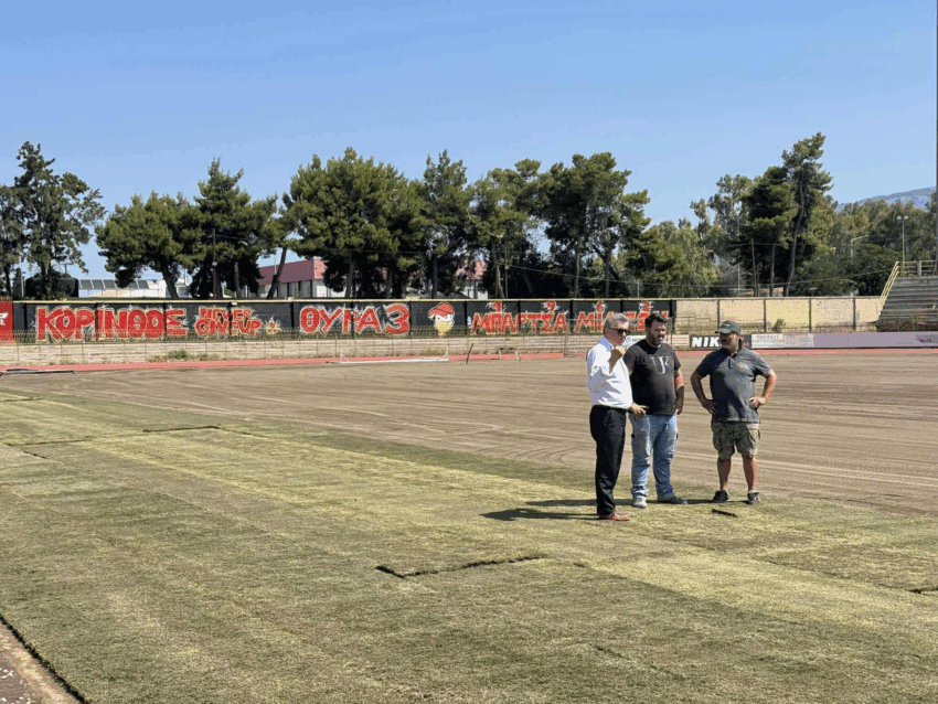 Mε γοργό ρυθμό συνεχίζεται το έργο της τοποθέτησης νέου, φυσικού χλοοτάπητα στο δημοτικό στάδιο της Κορίνθου.