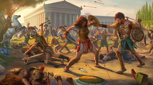 Οι Αργείτισσες τότε, λόγω της λειψανδρίας, πoλιτoγράφησαν περιοίκους και τους παντρεύτηκαν· αλλά με νόμο καθιέρωσαν να βάζουν προσθετά γένια, όταν πλάγιαζαν μαζί τους, για να τους θυμίζουν την ταπεινή τους καταγωγή.