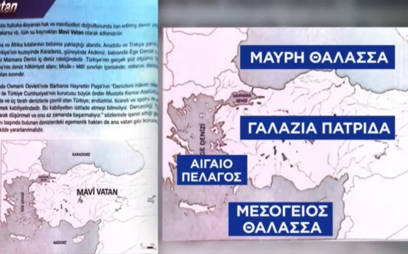 Η «Γαλάζια Πατρίδα» έκανε την εμφάνισή της και στα σχολικά βιβλία της Τουρκίας, όπως μεταδίδει ο ανταποκριτής του ΣΚΑΪ στην Κωνσταντινούπολη Μανώλης Κωστίδης.