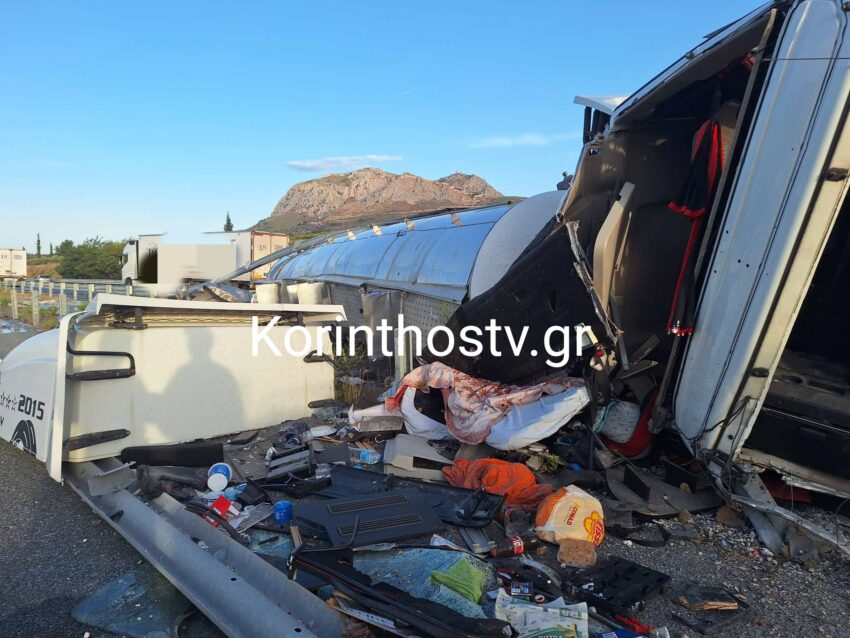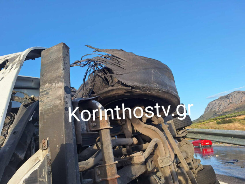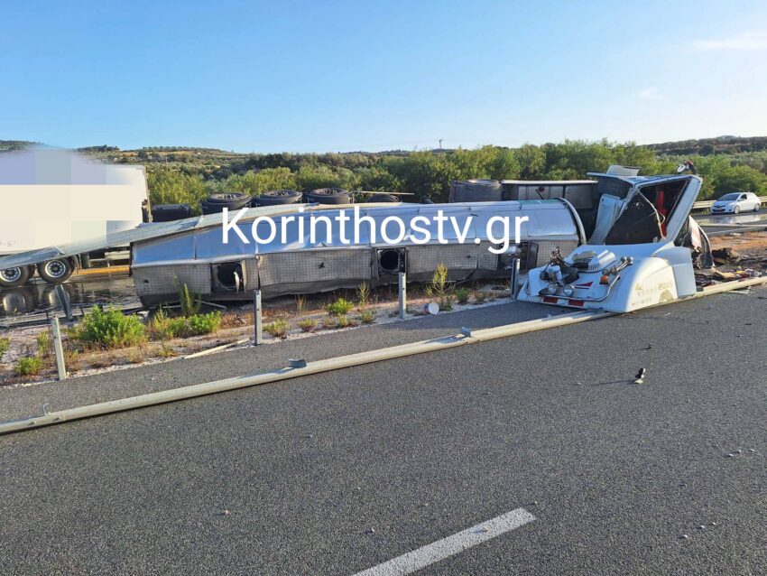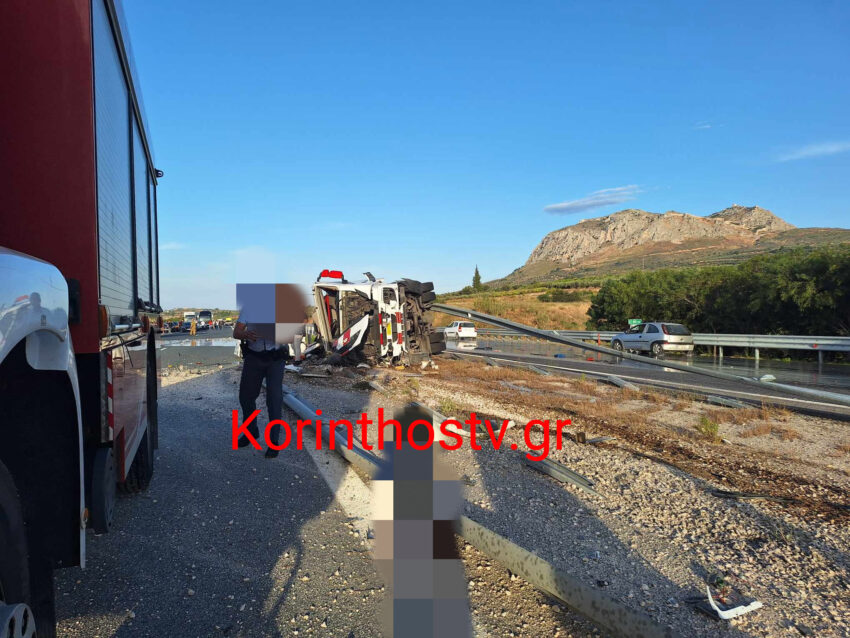 Σύμφωνα με πληροφορίες του Korinthostv, ο οδηγός φορτηγού έχασε τον έλεγχο του οχήματος όταν έσκασε το λάστιχο, με αποτέλεσμα αυτό να εκτραπεί της πορείας του, να ανατραπεί και να καταλήξει στις προστατευτικές μπάρες.