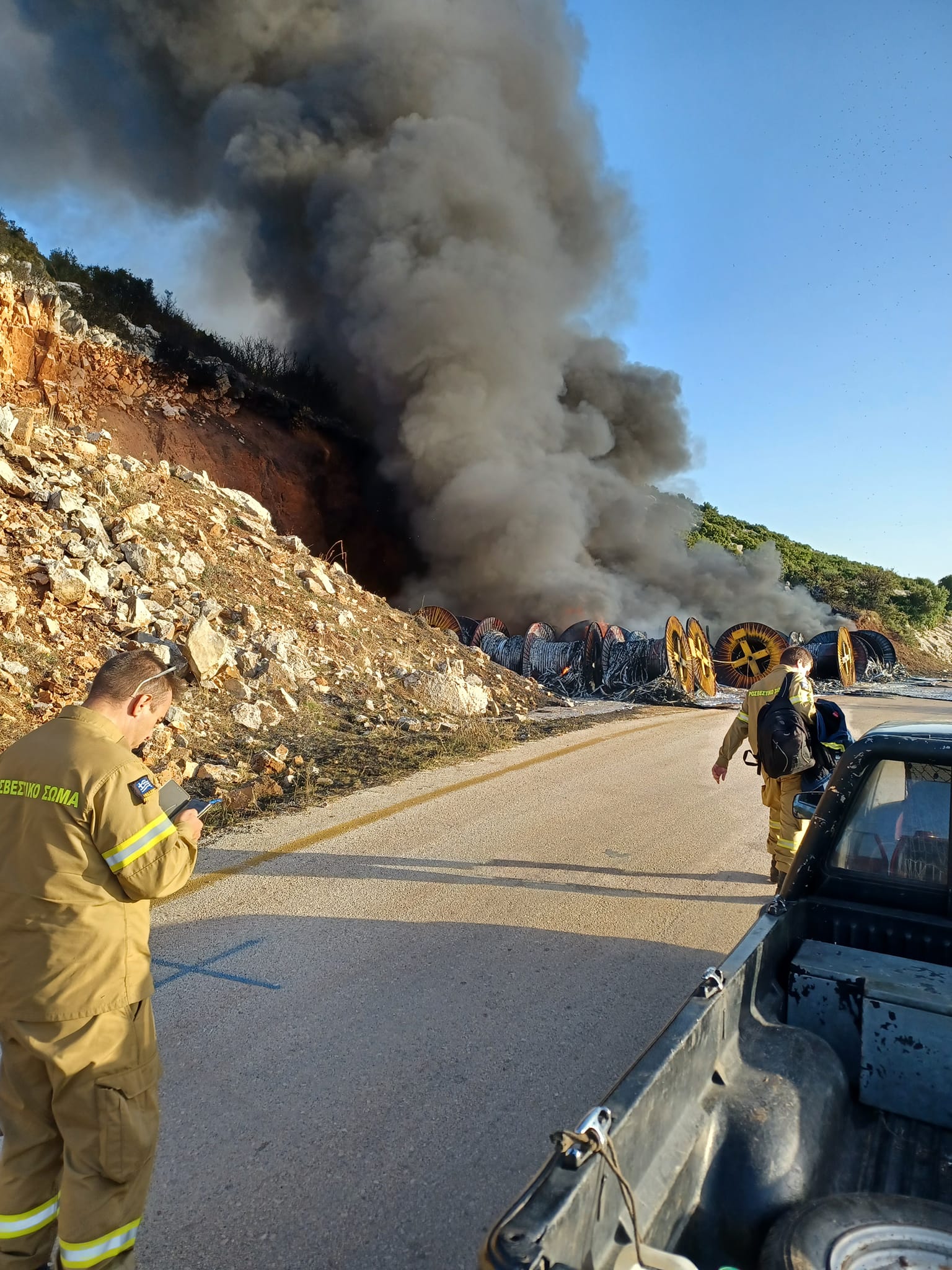 Συναγερμός σήμανε τα ξημερώματα του Σαββάτου στην Πυροσβεστική υπηρεσία Κορίνθου όταν ενημερώθηκε για φωτιά σε αποθηκευτικό χώρο πού υπήρχαν κουλούρες με καλώδια για τις ανεμογεννήτριες στο Αγγελόκαστρο Κορινθίας.