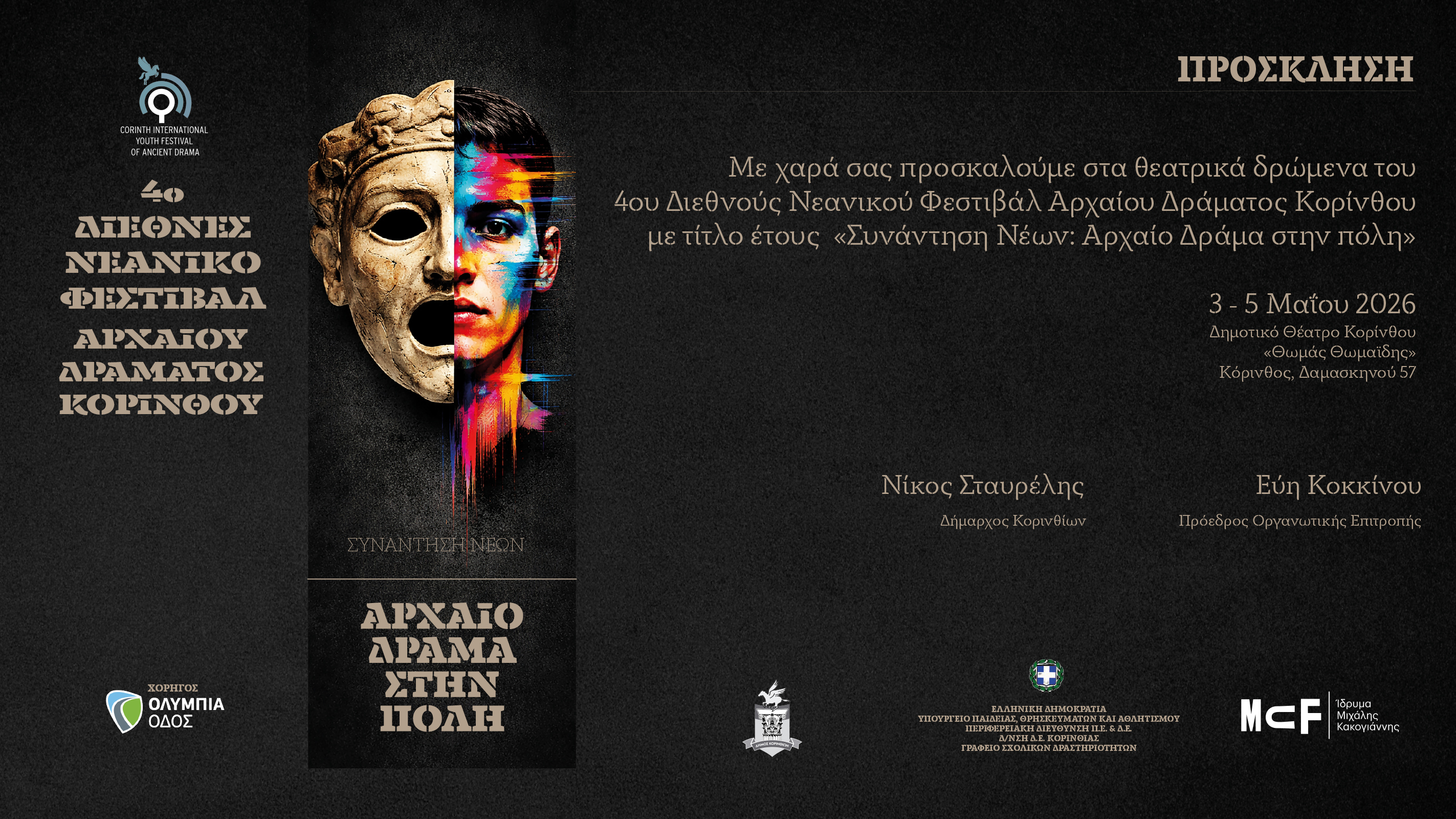 Κόρινθος | 3-5 Μαΐου 2026Τίτλος έτους: «Συνάντηση Νέων: Αρχαίο Δράμα στην Πόλη» Η Κόρινθος υποδέχεται το 4ο Διεθνές Νεανικό Φεστιβάλ…