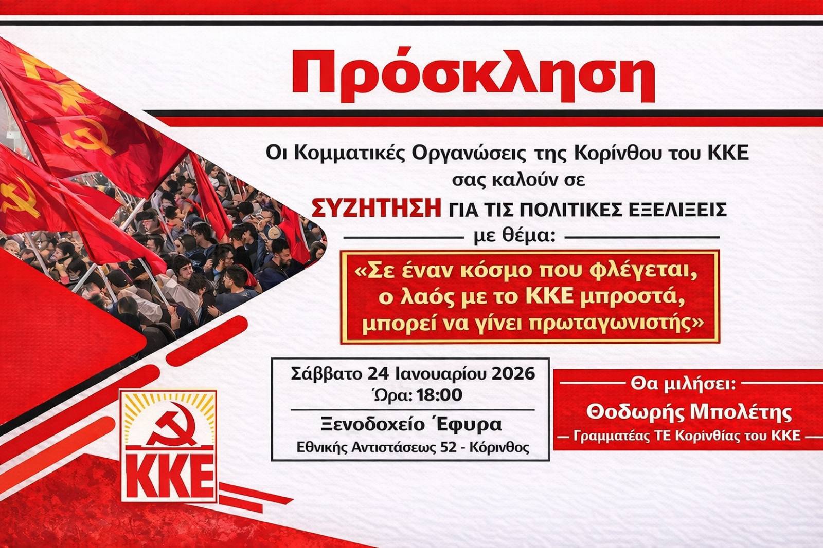 Οι Κομματικές Οργανώσεις της πόλης της Κορίνθου του ΚΚΕ διοργανώνουν συζήτηση με θέμα: "Οι τελευταίες πολιτικές εξελίξεις - Σε ένα…