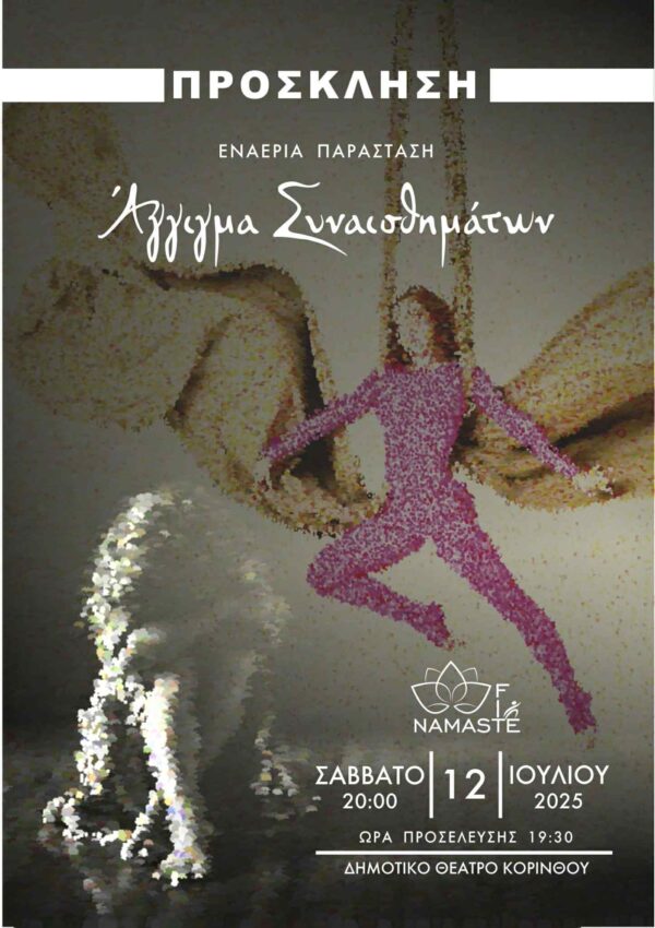 Με μεγάλη χαρά, σας προσκαλούμε στην εναέρια παράσταση από τη σχολή Namastefit, Νάνσυ Πούρου, με θέμα «Άγγιγμα συναισθημάτων» (εστιάζοντας στο bullying και την ενδοοικογενειακή βία), που θα πραγματοποιηθεί το Σάββατο 12 Ιουλίου 2025, στο Δημοτικό Θέατρο Κορίνθου. Σας περιμένουμε ολους να μοιραστείτε αυτή την καλλιτεχνική εμπειρία μαζί μας. Η εκδήλωση μας θα ξεκινήσει στις 20:00μ.μ. με άφιξη κοινού 19:30μ.μ.