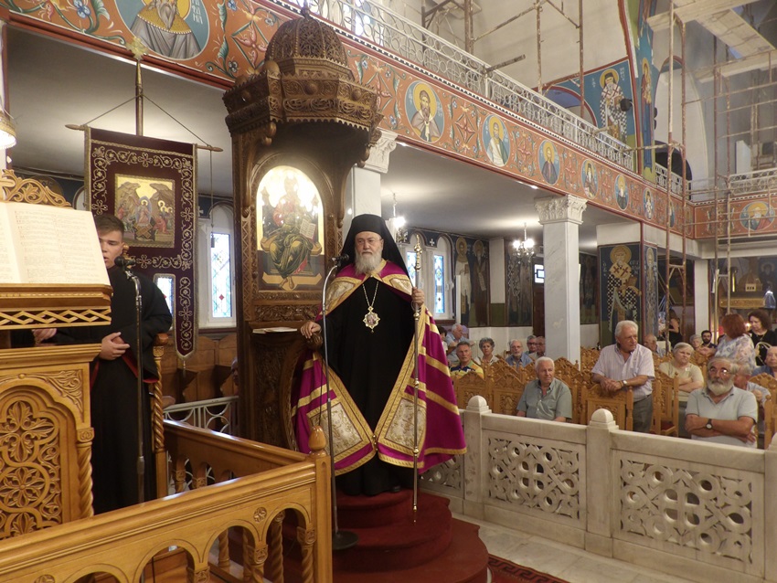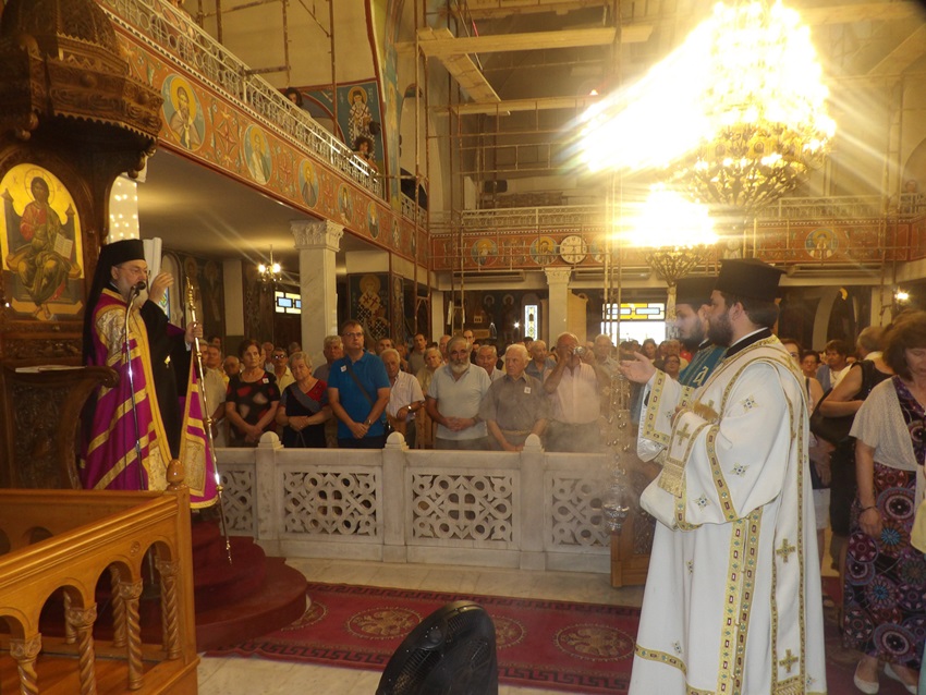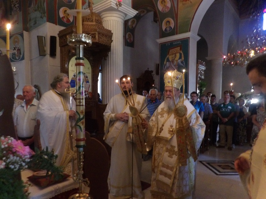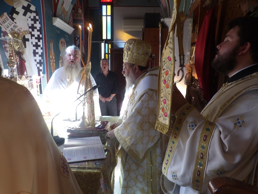 Στον Πανηγυρίζοντα Ι. Ναό Κοιμήσεως της Θεοτόκου Αρχαίας Κορίνθου της Θ. Λειτουργίας προέστη ο Σεβ. Μητροπολίτης Πτολεμαΐδος κ. Εμμανουήλ, ο οποίος ομίλησε επίκαιρα προς τους πιστούς, που από νωρίς είχαν κατακλύσει τον Ι. Ναό, συγχαίροντάς τους ταυτόχρονα για την πίστη και την αγάπη τους προς την Παναγία Μητέρα του Κυρίου μας. Ολοκλήρωσε τον λόγο του ευχαριστώντας για μια ακόμα φορά τον Σεπτό Ποιμενάρχη μας ο οποίος με πολλή αγάπη του παρεχώρησε Ι. Θυσιαστήριο για να τελέσει την Θ. Λειτουργία, αυτή την τόσο σημαντική ημέρα για την Εκκλησία μας.