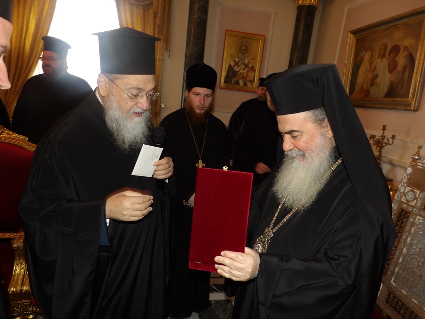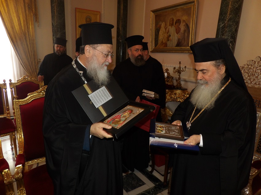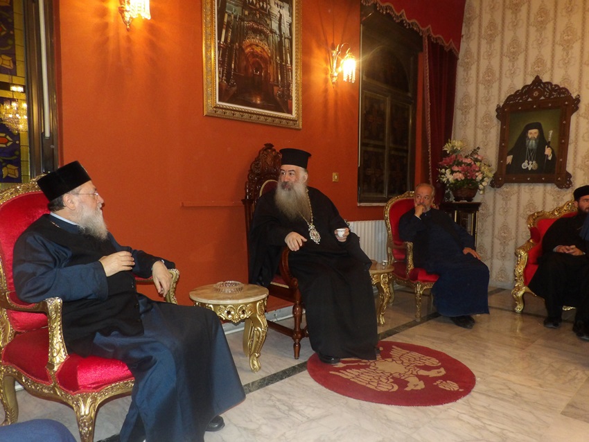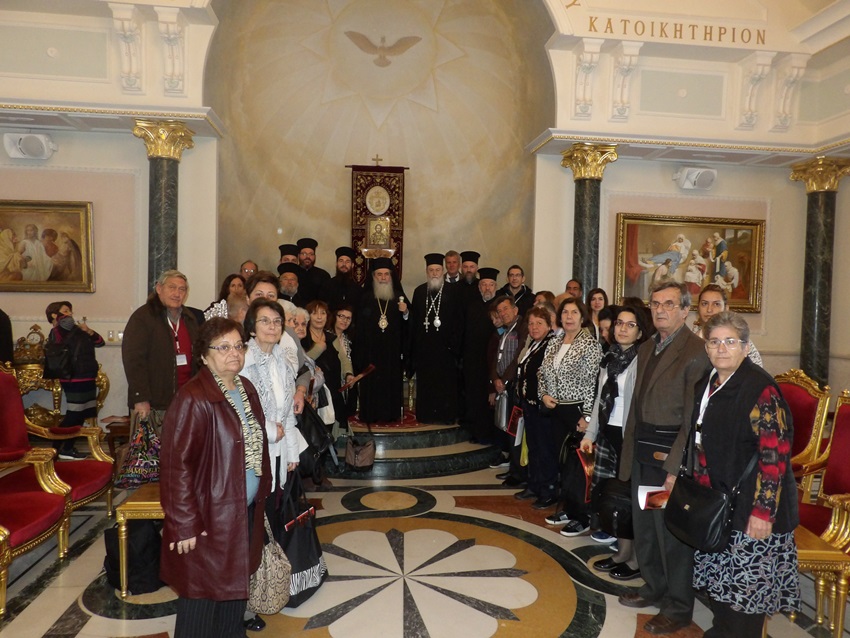 Εκτός από το πρόγραμμα των προσευχών και των ξεναγήσεων στα «Άγια Πατήματα», ο Σεβ. Μητροπολίτης μας και όλα τα μέλη της Ιεραποδημίας  επισκέφθηκαν κατά χρονική σειρά την Παρασκευή, 23 Νοεμβρίου 2018, τον Πατριαρχικό Επίτροπο στο Αμάν της Ιορδανίας Σεβ. Αρχιεπίσκοπο Κυριακουπόλεως κ. Χριστοφόρο, όπου έτυχαν θερμής υποδοχής, συμμετέχοντες στην εορτή των Κατηχητικών Σχολείων της Τοπικής Εκκλησίας. Την Δευτέρα, 26 Νοεμβρίου 2018, καθηκόντως τον Μακαριώτατο Πατριάρχη Ιεροσολύμων κ. Θεόφιλο, ο οποίος τους υποδέχτηκε στην Αίθουσα του Πατριαρχικού Θρόνου, τους καλωσόρισε στους Αγίους Τόπους και τους ομίλησε πνευματικώς, αναλύοντάς τους και τα προβλήματα που απασχολούν σήμερα το Πατριαρχείο και τα Πανάγια Προσκυνήματα, ευχηθείς θερμώς να αποβεί άξια η «Ιερά Θεωρία» τους. Τον Μακαριώτατο Πατριάρχη κ. Θεόφιλο, εκ μέρους των προσκυνητών, ευχαρίστησε ο Σεβ. Μητροπολίτης μας  διαβεβαιώνοντάς Τον για την αγάπη και τον σεβασμό όλων προς το πρόσωπό Του και το «Τάγμα των Σπουδαίων», προσφέροντάς Του, ως ένδειξη τιμής, την «λογία» της Κορινθιακής Εκκλησίας κατά μίμηση της παραδόσεως που εγκαινίασε στην Τοπική μας Εκκλησία ο Απόστολός μας Άγιος Παύλος (Α΄ Κορ. ιστ’, 1-5), προς ενίσχυση των αναγκών του παλαιφάτου Πατριαρχείου, ενώ ο Μακαριώτατος ανταπέδωσε, δίδοντας ως ευλογία, εις μεν τον Ποιμενάρχη μας Αρχιερατικό Σταυρό και Εγκόλπιο, εις δε τους Κληρικούς και λαϊκούς αναμνηστικά του Πατριαρχείου.