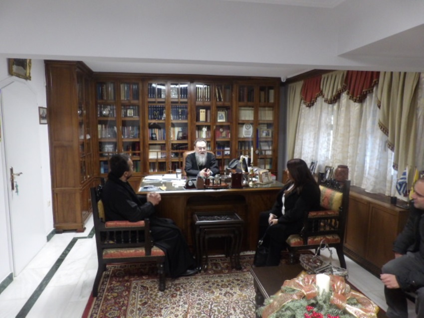 η Διευθύντρια του Μουσικού Σχολείου Κορίνθου κ. Ειρήνη Καραπατά, Καθηγήτρια Μουσικής, συνοδευομένη υπό των Αιδεσ. π. Δημήτριο Παπαδάκη, Καθηγητή Βυζαντινής Εκκλησιαστικής και Ελληνικής Παραδοσιακής Μουσικής, κ. Αγγελική Παπαδοπούλου, Θεολόγο και κ. Ζαχαρία Γιαννακά, Φιλόλογο,για να παραλάβουν μουσικά όργανα και εξοπλισμό, κατόπιν σχετικής αιτήσεώς τους στον Σεβ. Μητροπολίτη μας κ. Διονύσιο. Ο σεπτός Ποιμενάρχης αφουγκραζόμενος τις ανάγκες του Μουσικού Σχολείου Κορίνθου και ενόψει της εορτής των Αγίων Τριών Ιεραρχών, προστατών της Παιδείας και των Γραμμάτων, η οποία για κάποιον αδιευκρίνιστο λόγο μεθοδεύεται σταδιακά να εκλείψει, προσέφερε τρεις (3) Ταμπουράδες (παραδοσιακά μουσικά έγχορδα όργανα), ένα φορητό ηλεκτρονικό υπολογιστή και έναν προτζέκτορα (προβολέα ήχου και εικόνας) για τις εκπαιδευτικές ανάγκες του Σχολείου της πόλεώς μας.