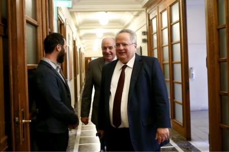 Στο υπουργείο Εξωτερικών τον υποδέχθηκε ο Νίκος Κοτζιάς με τους δύο άνδρες να έχουν θερμή χειραψία και στη συνέχεια κατευθύνθηκαν στο 1ο όροφο του ΥΠΕΞ για την τελετή παραλαβή-παράδοσης.